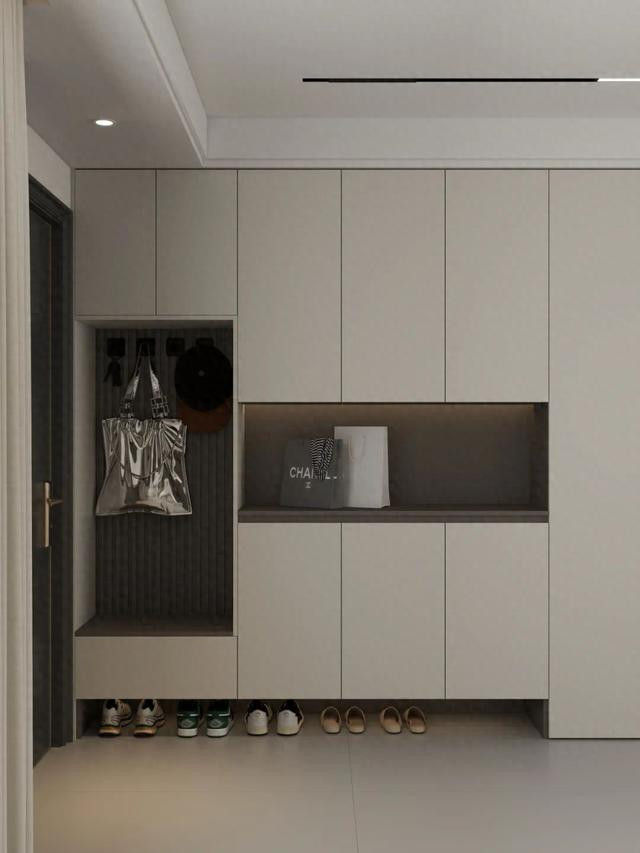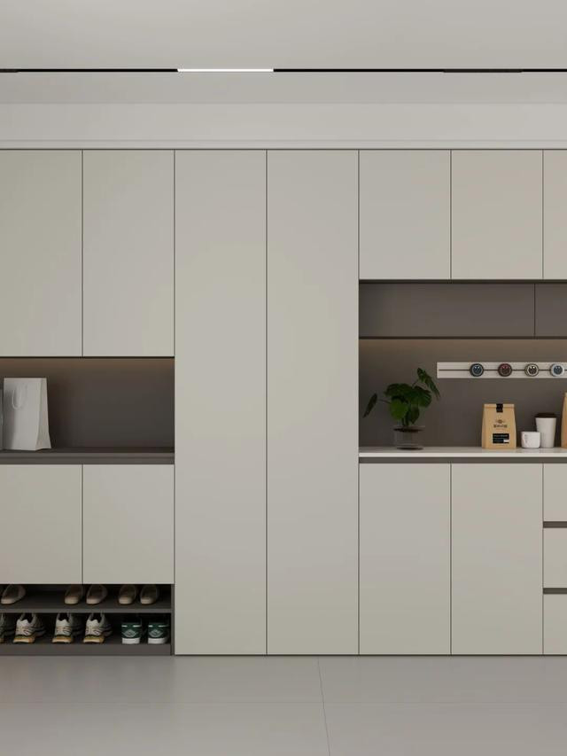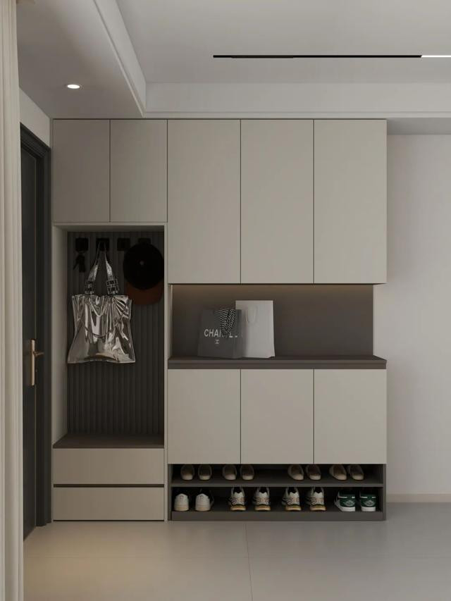 这是今天要分享的空间,入户没有玄关的位置,鞋柜与餐边柜一体设计。一体柜设计实现了"一柜多用"的高效理念。它不仅满足了基本的鞋物收纳需求,还能同时承担餐边柜的储物功能,甚至可以作为客厅与餐厅之间的过渡元素。